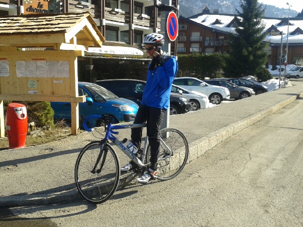 "Aujourd'hui, une nouvelle sortie de 60km. Avec vu sur le Mt Blanc en partant de la maison (avec un peu de cumulus autour du massif). Il a neigé dans la nuit. Je me suis dis : j'y vais, j'y vais pas, allez j'y vais avec le retour des éclaircies. Arrivé sur Cluses, je retrouve des chutes de neige et de température. J'en ai chié et mon vélo prend cher avec le sel et l'humidité sur la route. Mais revenu sur Sallanches, le ciel se déchire et le soleil fait son apparition, alors je continue. Arrivé sur Passy, rebelote retour de la neige et du vent de face surtout, grrrrrrrrrrr. FRIGORIFIE le retour fut compliqué. Mais dès que je pense à Paul, ma famille, Intersport Saintes (Cédric et Eric du rayon cycle m'ont fait un vélo phénoménal UN GRAND MERCI), ma motivation est optimale. Avec le retour du froid et de la neige, je vais varier ma préparation entre course à pied, randonnée et sortie vélo (quand la route sera dégagée et sèche ; entre le froid et l'humidité sur l'asphalte c'est une patinoire) Voilà, pour les infos. Bon courage à vous pour la préparation ENORMES BISOUS à Paul, Lise, Mathieu, Ma sœur, et léchouille pour Miki."
