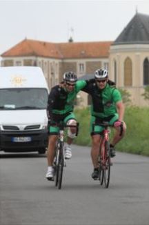 Avant cela on recueille avec délectation les encouragements de Céline et Laëtitia, postées sur le bord de la route, qui nous reviennent toutes bronzées de leur journée de farniente à Royan. Ça nous met la banane, et même pour Gaby une pêche d’enfer, au point qu’il nous bricole une échappée à 3 kms de l’étape, histoire d’arriver en tête devant ce public féminin… Ça sert à rien Gaby, c’est pas le tour de France et nos hôtesses feront la bise à tous, et pas seulement au premier !
