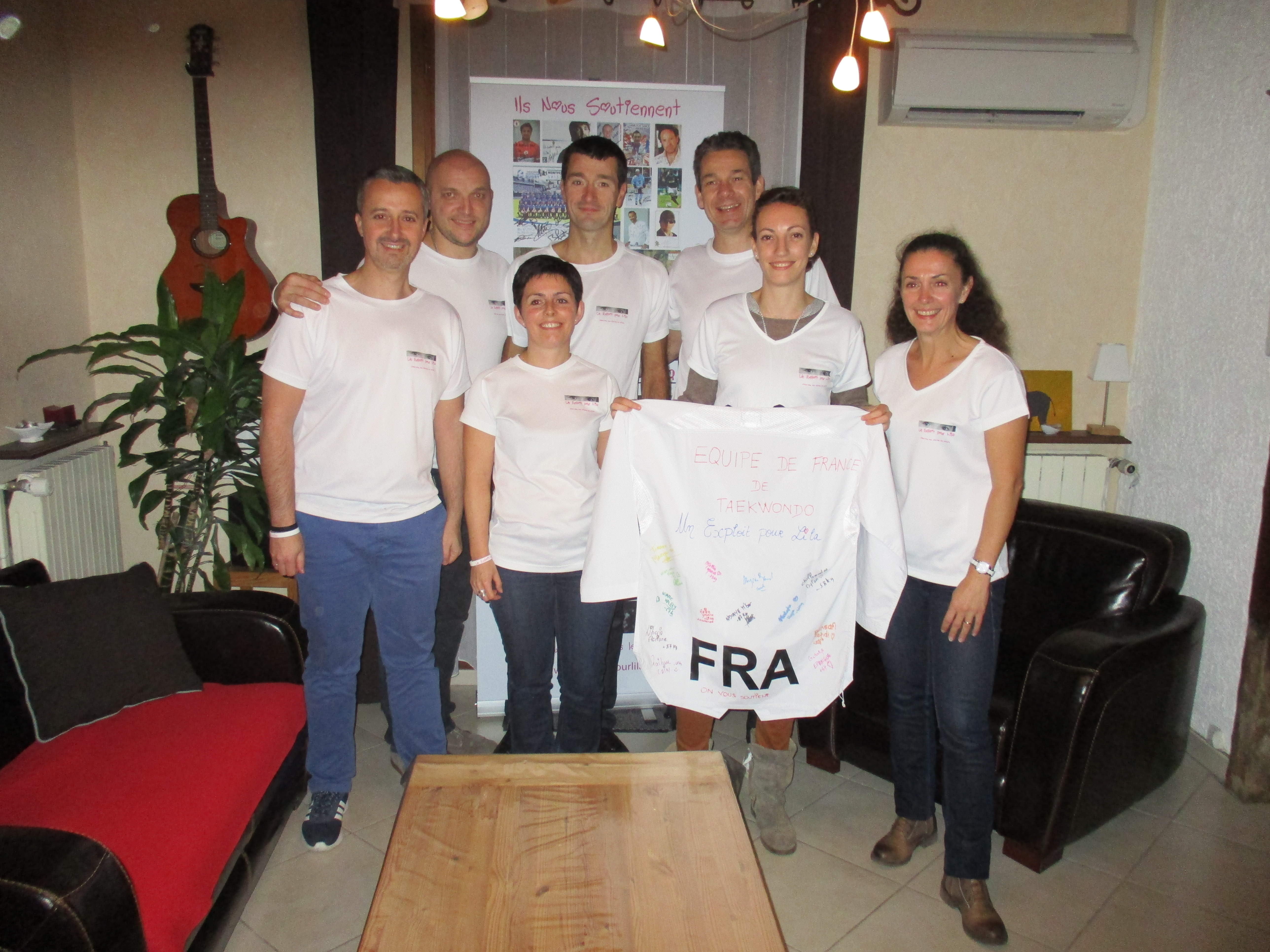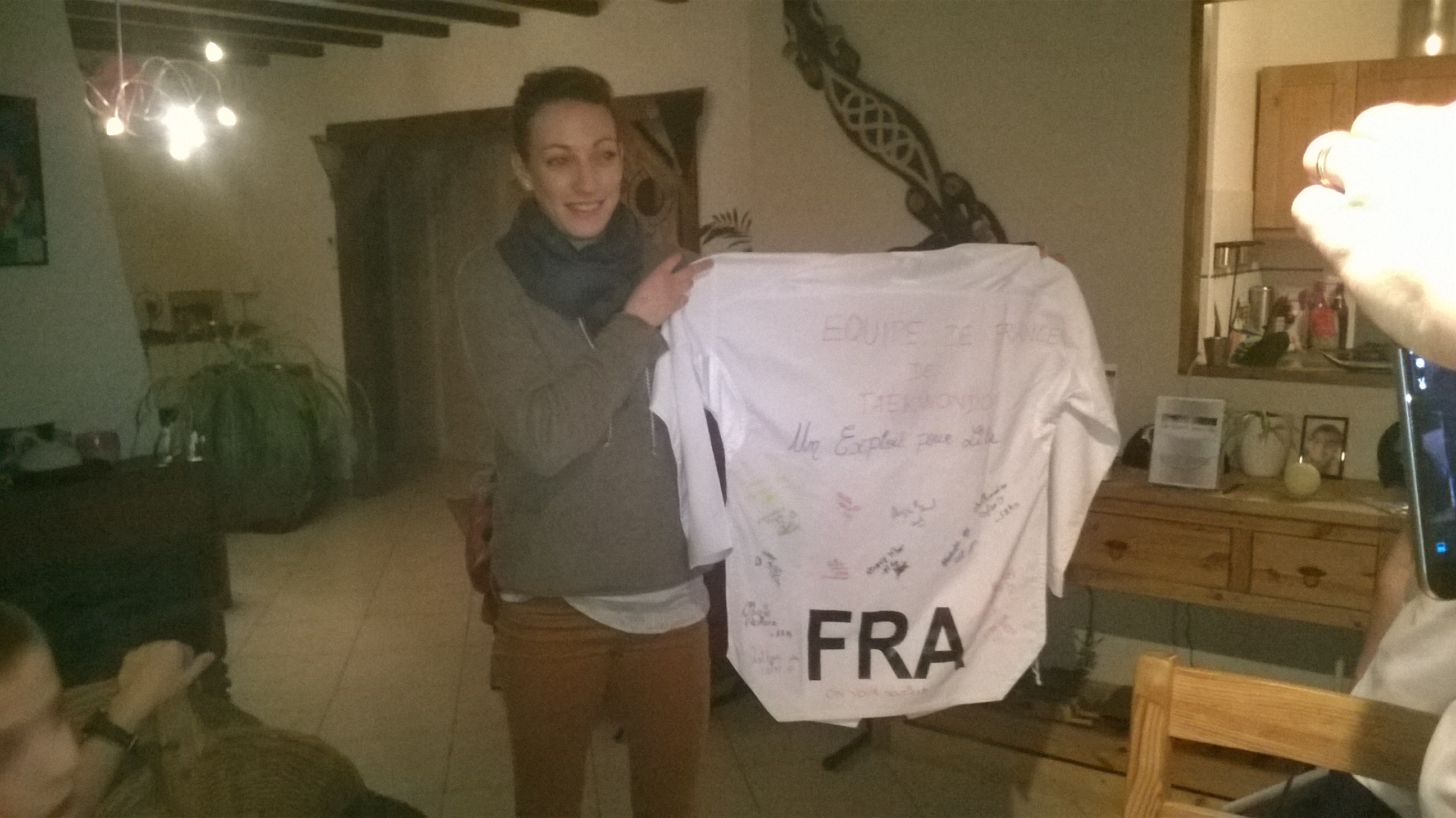 Floriane n’est pas venue les mains vides, elle a souhaité offrir un dobok (vêtement de Taekwondo pour l'entraînement du corps et de l'esprit utilisé depuis des siècles dans la tradition coréenne ) dédicacé par tous les membres de l’équipe de France, ainsi qu’un second dobok qui fera l’objet d’un lot pour notre future tombola Olympique, mais chut !! nous vous en reparlerons prochainement.