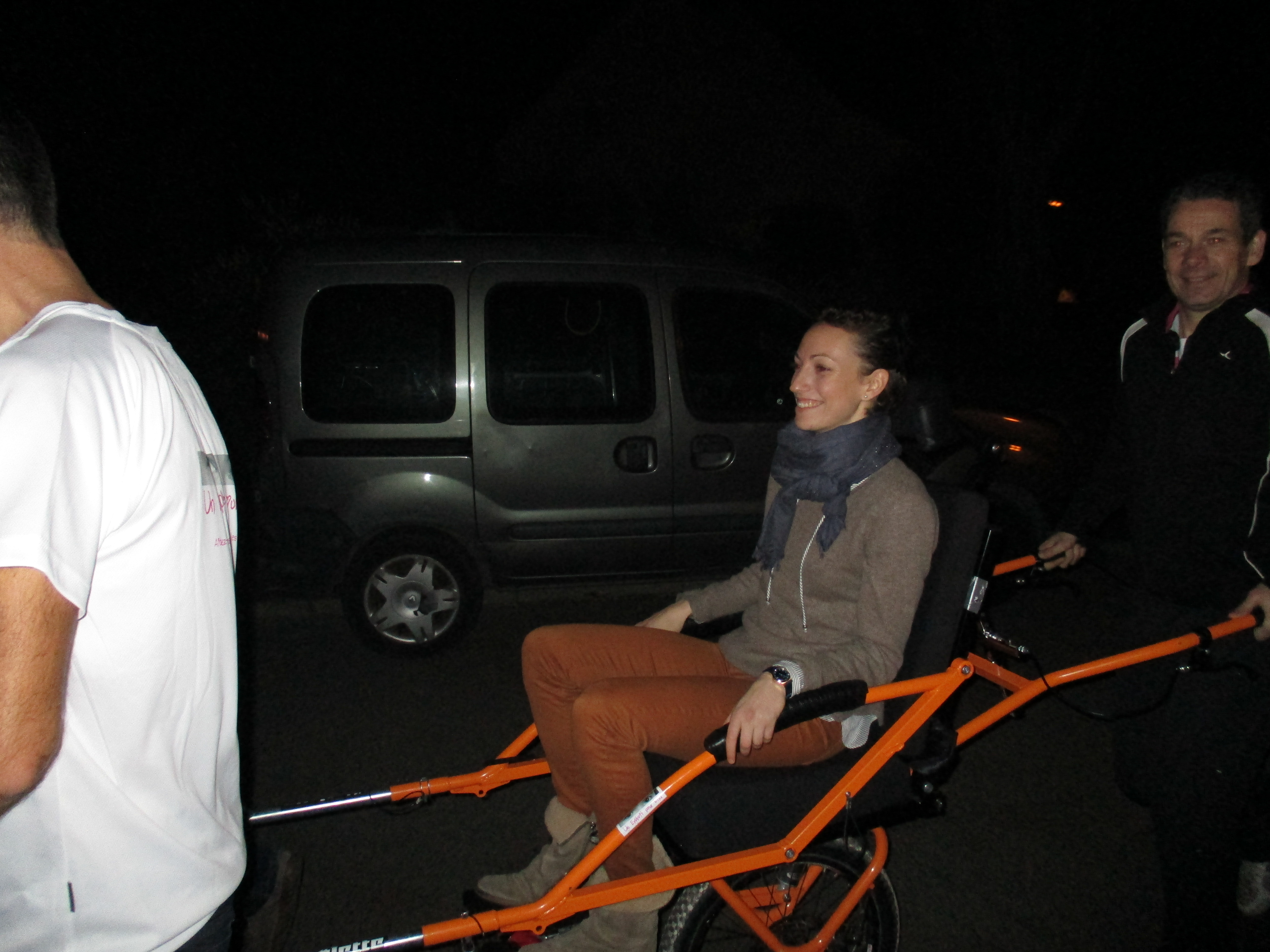Les présentations faites, Floriane très enthousiaste a eu envie d’essayer le vélo Fauteuil avec Emma et ensuite la joelette, entourée d’Arnaud, Sébastien et Jean Christophe.