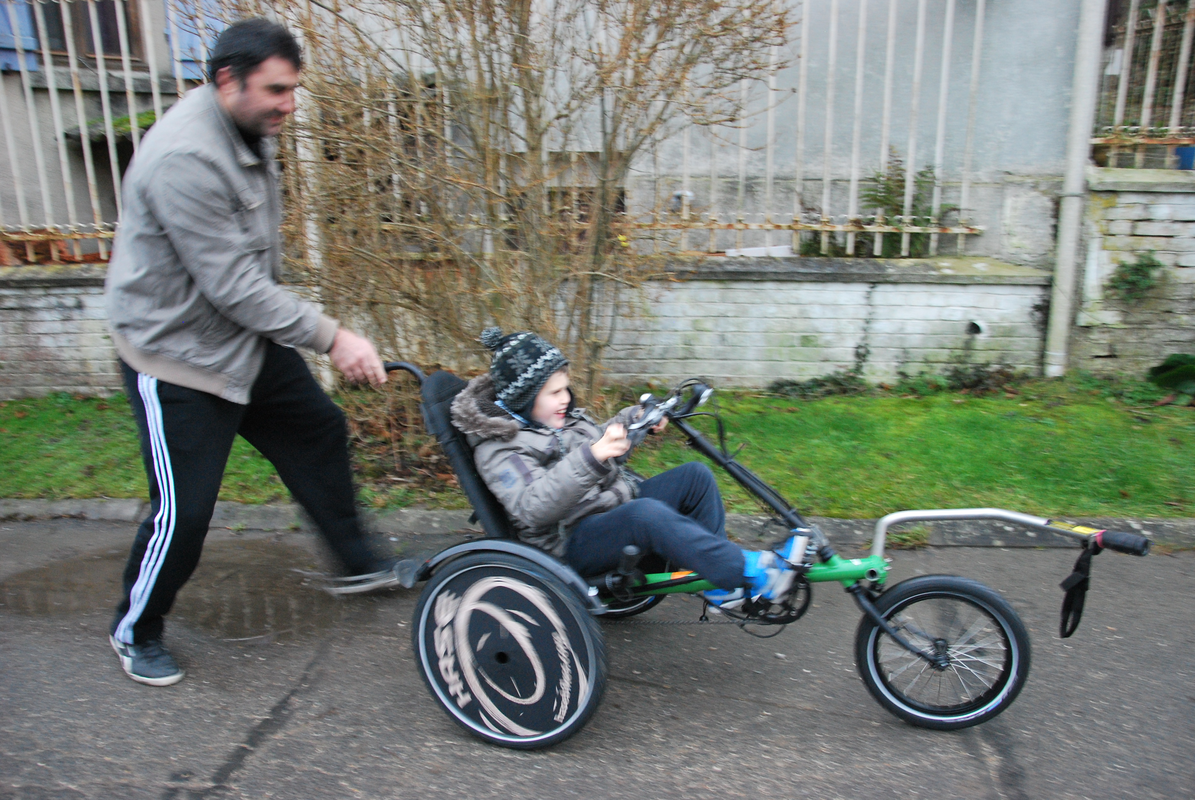 Paul prend place sur le Trets avec Papa aux commandes à l'arrière, qui semble agréablement surpris par ce trike.