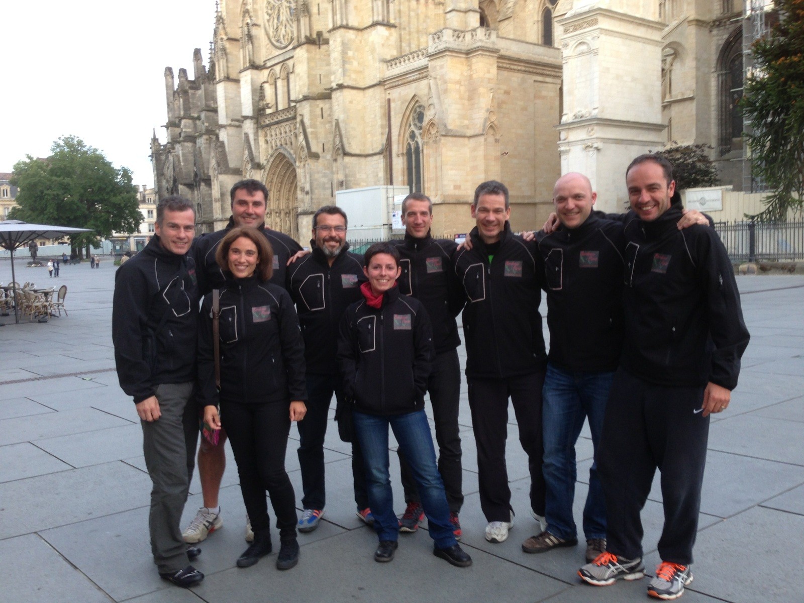 Après un premier run d’une bonne heure, où jicé assure une grande partie du train, on se fait une petite halte au soleil sur la place d’une église où se sont installés Pierre et Miki pour nous acclamer au passage. On en profite un peu, au point de laisser rentrer dans le groupe deux nouveaux coureurs chaudement recommandés par une ravissante jeune femme qui fait leur assistance en camping-car.
