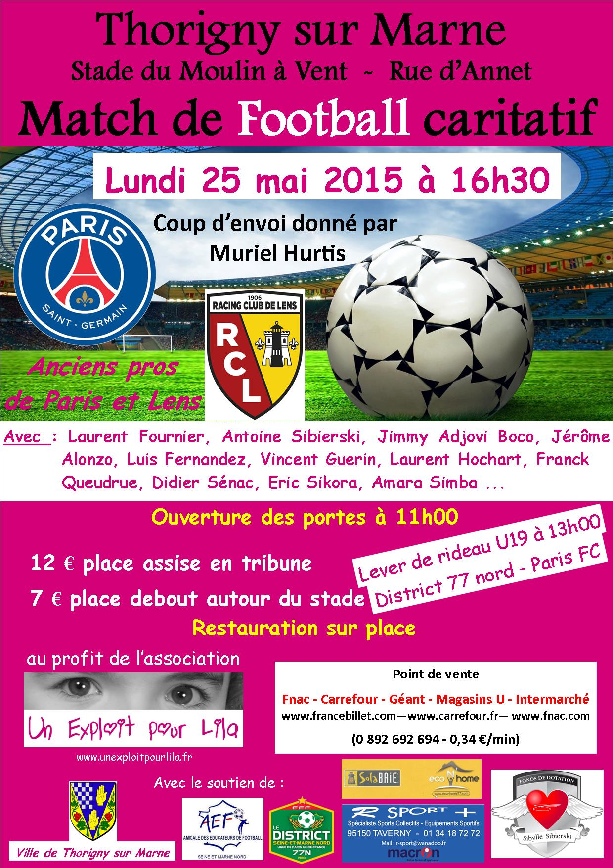 L'association organise une rencontre exceptionelle de football opposant les anciens joueurs pros du PSG et du Racing club de Lens , le lundi 25 mai 2015.